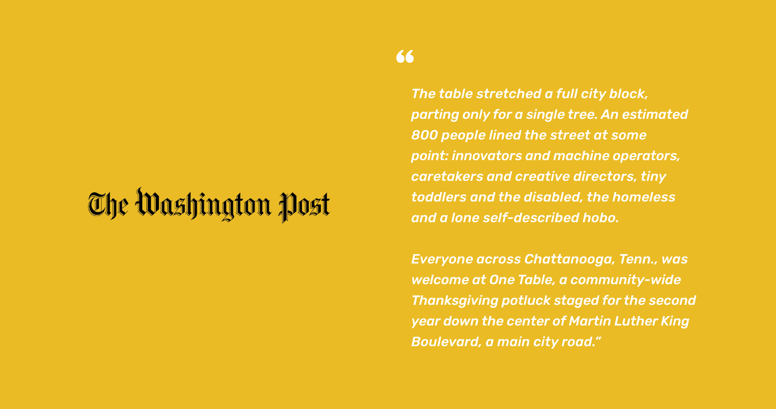 Originally called One Table, this event was born from a desire to unite different groups of people in Chattanooga, Tennessee. In 2014 the staff of Causeway, a local nonprofit, were walking to lunch discussing the invisible wall that stood on Martin Luther King Boulevard, dividing two of the city’s green spaces. One was known as a popular venue for outdoor concerts and played a key role in Chattanooga’s startup culture. The other was known as a place for people experiencing homelessness, or who lived in the nearby public housing unit. They decided to invite both sides, and the broader groups that they represented, to share a meal at one table in the middle of that dividing line.